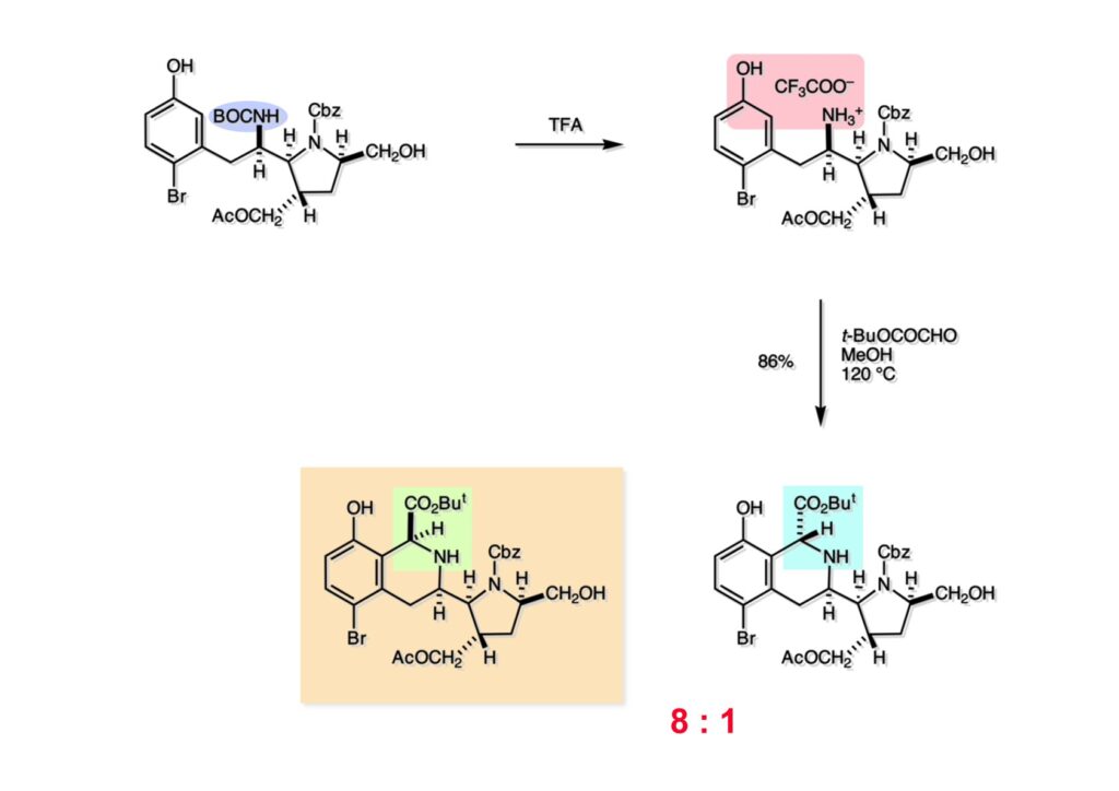 (1-1) のBoc基をTFAで外し、TFAを留去後に (1-2) とt-butyl glyoxylateとのPictet-Spengler反応を高温で行ったところ8:1の比で望むテトラヒドロイソキノリン体 (2-1) が主生成物として得られた。因みに、methyl glyoxylateを用いた時は立体選択性はほぼ得られなかった。