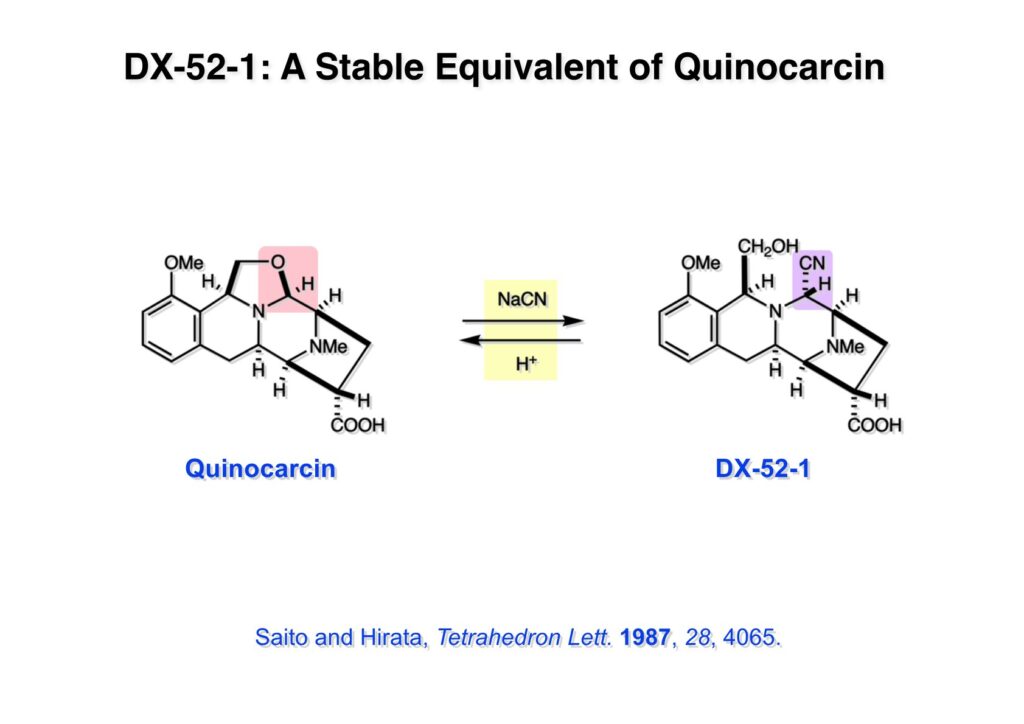Quinocarcin (1-1) は協和発酵で単離構造決定された化合物で、NaCNを作用させると安定なアミノニトリル (1-2) に変換できると報告された。