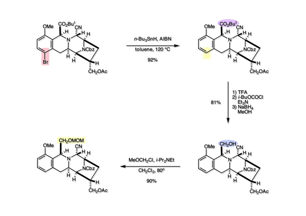 ここでお役御免の (1-1) のブロモ基をラジカル的に還元して (1-2) に変換し、更にt-ブチルエステルをTFAでカルボン酸にしてから混合酸無水物経由でアルコール (2-2) へと導いた。この頃はまだ水酸基の保護に各種のシリルエーテルを使うことが一般的ではなく、ここではMOMエーテル (2-1) にして保護した。