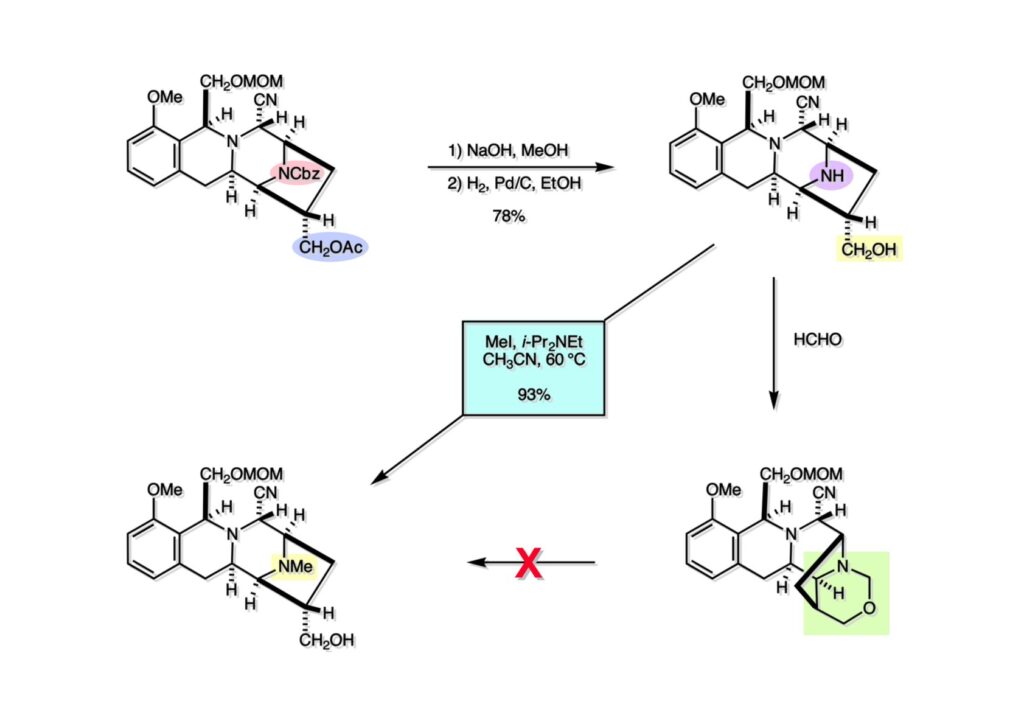 (1-1) のアセテートを加水分解してからCbz基を加水素分解した理由は、Cbz基を先に外すとアセテートからアセチル基が転位してアミドになってしまうからだ。ところがフリーのアルコール存在下で (1-2) をホルマリンとNaBH3CNで還元的メチル化をしようとしたら、tetrahydro-1,3-oxazine (2-2) になってしまい、N-メチル体 (2-1) に変換できなかった。仕方ないので、MeI-Hünig baseのコンビネーションでN-メチル体 (2-1) を得た。