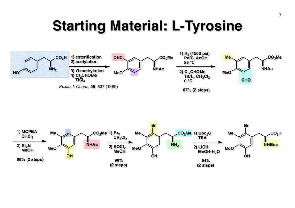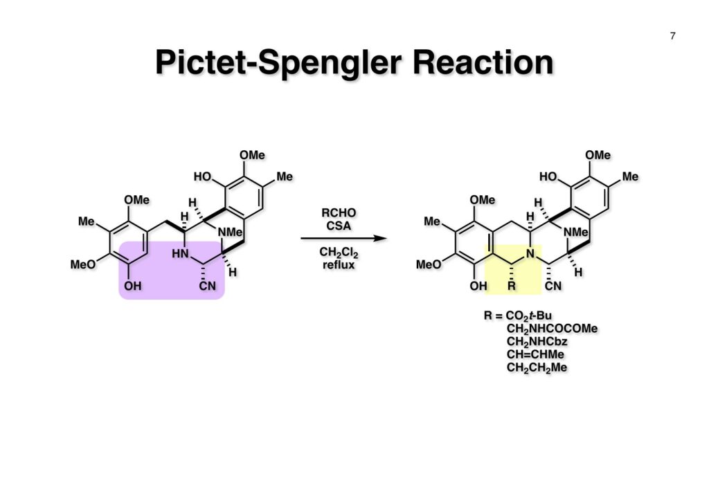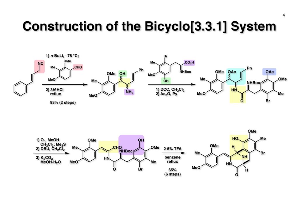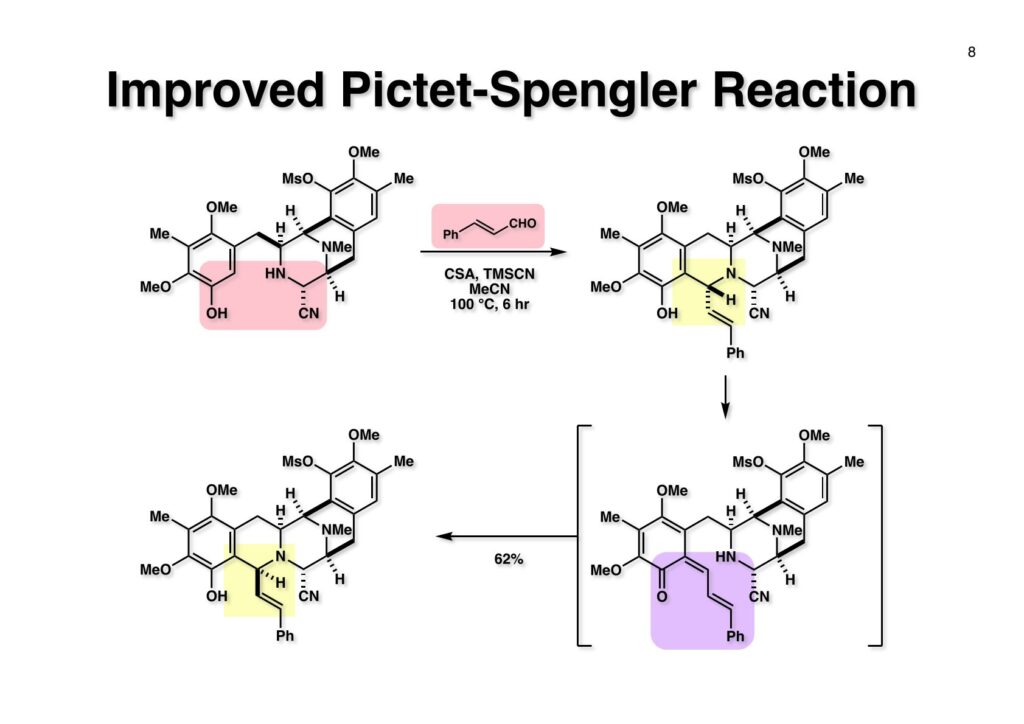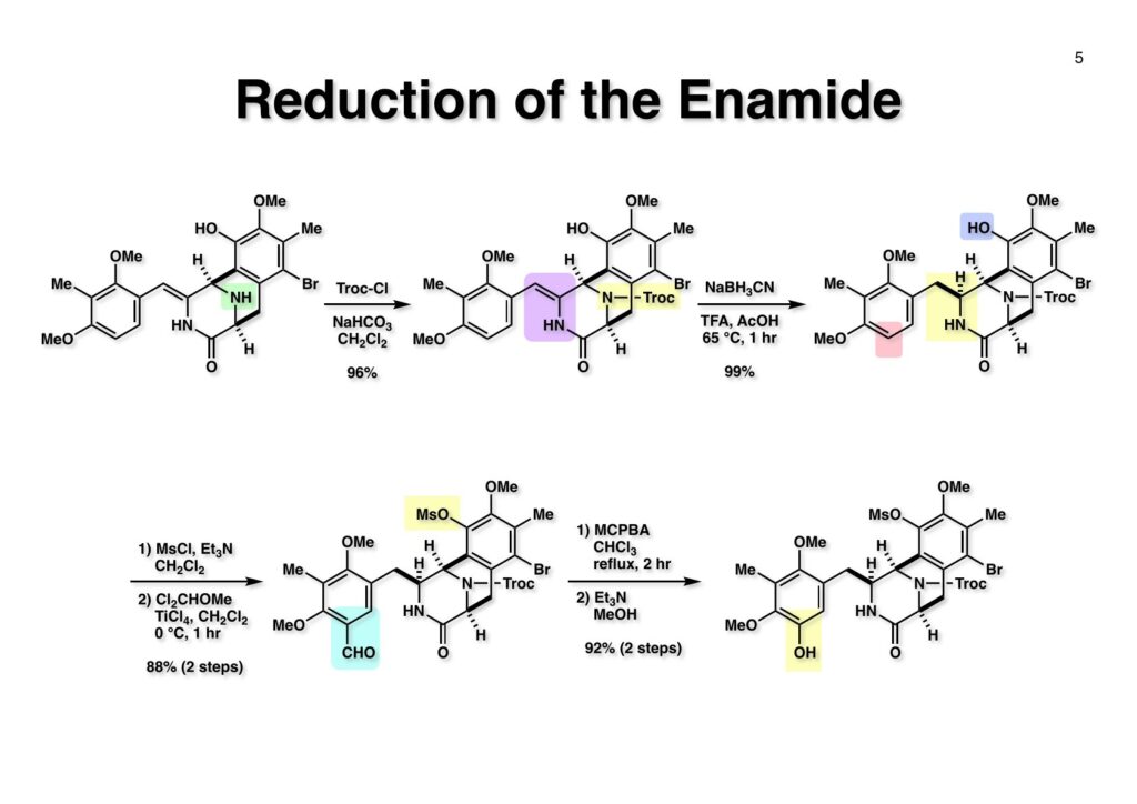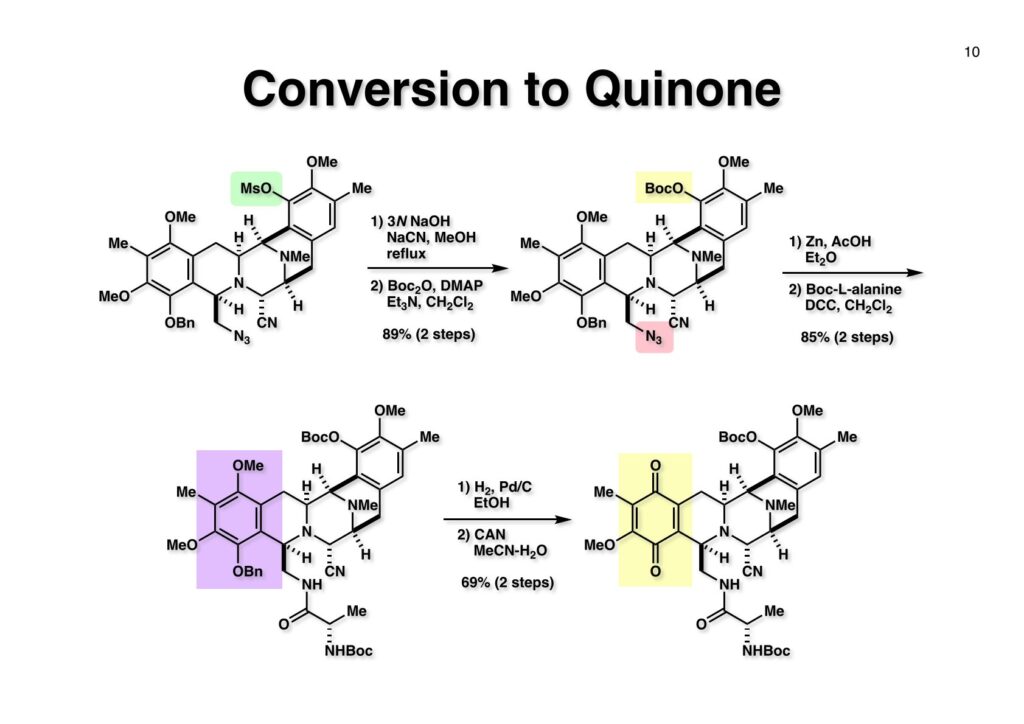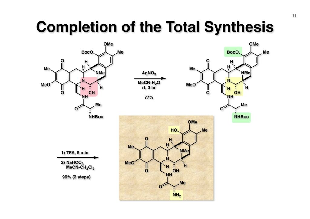Safracin Bは1983年に吉富製薬(後に田辺三菱製薬に吸収合併され現在は田辺ファーマ)で単離構造決定された抗生物質で抗腫瘍活性も示すが薬にはなっていない。Saframycin Aに近い構造を有しており、ecteinascidin 743の合成ルート開発にも寄与すると思い、中国生まれで香港育ちのMui Cheungに全合成を始めてもらった。確かFlorida A&M University卒で、それほどアカデミック界では名の知られたところではなかったので、なんでわざわざ香港の高校からそこに留学したのか聞いた事があった。彼女曰く、ここなら3年で卒業できると思ったから、というのが記憶に残っている(実際3年で卒業してライス大学の大学院に入学)。頭も良く、腕も良い優秀な学生だったが、ソフトボールはやった事が無かったのか、私とキャッチボールをしたらグローブでなく顔で受けて?しばらく顔面に黒いアザが残ってしまった(そのうち消えたけど)。私がライス大学から東大に移る時に同僚のMarco Ciufoliniに彼女の面倒を見てもらうことにした。日本に到着した後にMuiから論文の原稿が送られてきたが、かなり直さないといけないと思いつつ、後回し、後回しにしていたらもう論文を出すのが面倒くさくなってそのまま今日に至ったという、彼女の顔をまともに見られない為体である。Muiはさらにthiangazoleというtantazole系の化合物の全合成も達成したが、基本的にはtantazole Bの全合成ルートを踏襲しているので、まあ論文を出すほどでもないか、とボツにしてしまった。こんな酷いボスの下で可哀想なMuiはよく頑張ったな、と思う。ただ、彼女はノシル基の開発に関しては大きな貢献をしたので、まあ勘弁してくれと、か細い声でささやいている。なおMuiは現在GSK (GlaxoSmithKline) Pharmaceutical CompanyのVice President, Global Discovery Chemistryとなって米国の製薬業界で活躍しているので遠巻きながら応援している。(この項を書き終えてからMuiに謝罪のメールを送ったところ明るく許してもらったことを記しておきます)