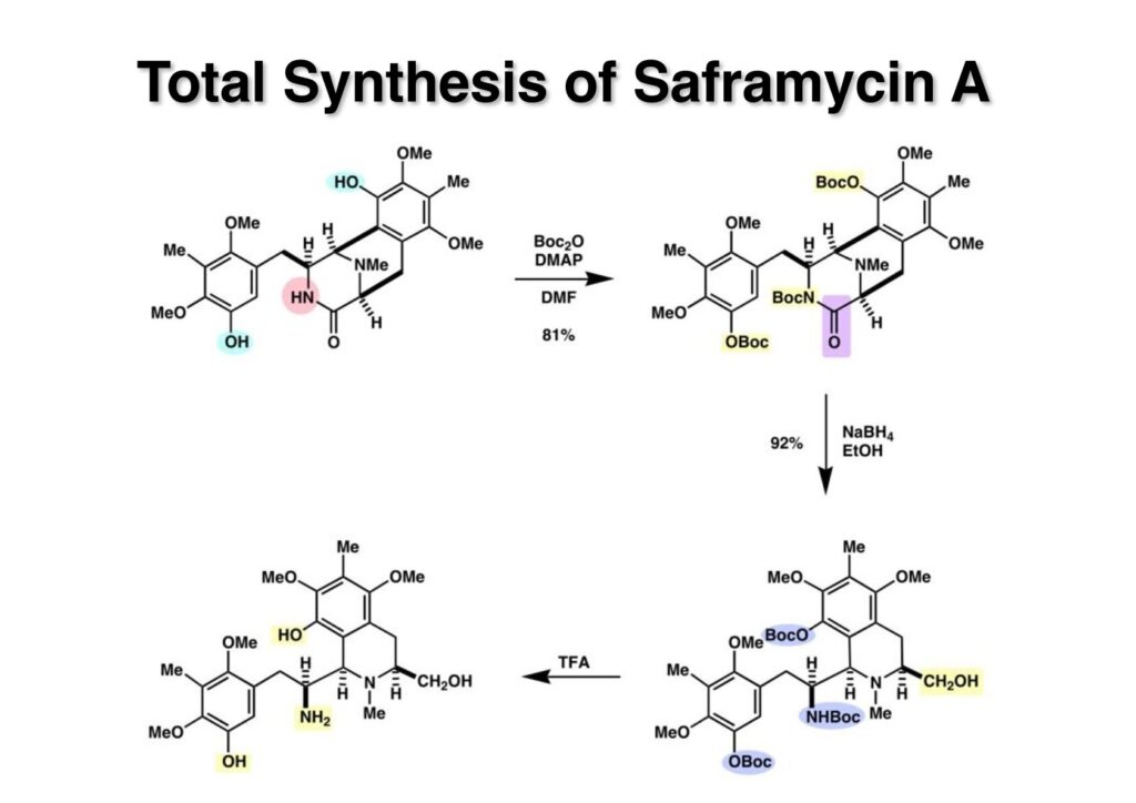 Saframycin Bとsaframycin Aの論文発表年に8年の間隔がある理由は、私自身のやる気が今一つ足らなかったのと、学生が良いところまで到達しながら、あと一息のプッシュが足らなかったのかもしれない。やる気が無いとはいえ、そう野ざらしにもしておけないので、mitomycin Cの全合成を終えたLihu Yangにこのプロジェクトを終わらせるように頼んだ。程なくLihuは合成を完成させたが、一番の鍵となったのはフェノール基2つとアミン存在下で一級アルコールのSwern酸化を成功させたところだろう。Saframycin Aを合成するためにはラクタム (1-1) のアミド結合を切ってPictet-Spengler反応を行わなければならない。(1-1) をBoc2OとDMAPで処理すると容易に二つのフェノールとラクタムNHにBoc基が導入された化合物 (1-2) が得られる。これをNaBH4で還元すると (2-2) を与え、更にTFA処理をすると3つのBoc基が落ちてアミノフェノール体 (2-1) に変換された。